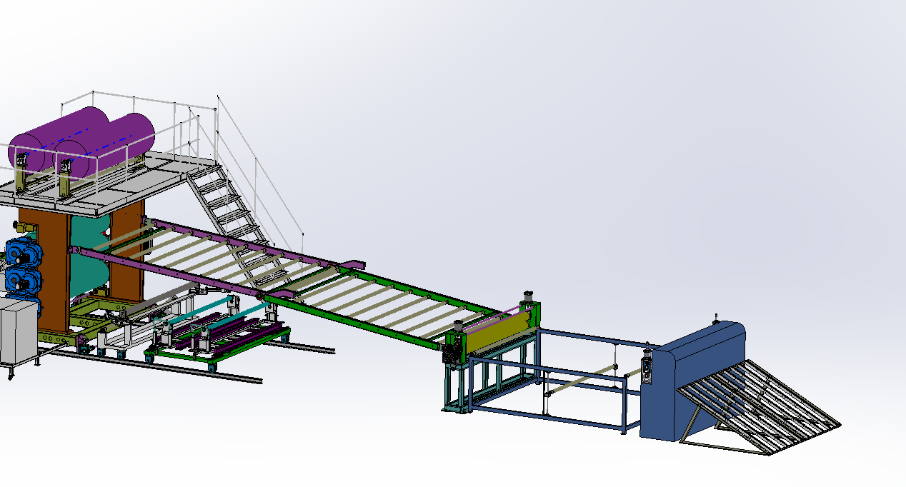 (八)下放卷裝置(熱腹合無紡部裝置) 單工位1)下放卷安裝與托架下; 雙工位放卷; 放卷速度采用磁粉控制;下放卷架子與三輥底座為螺絲連接;與三輥能同步前后移動; 在最下面三輥的支架安裝個托架的支架;防止下放卷在放無紡布是不能與輥筒摩擦; 2)放卷采購磁粉控制器控制張力;放卷整體糾偏系統(tǒng)